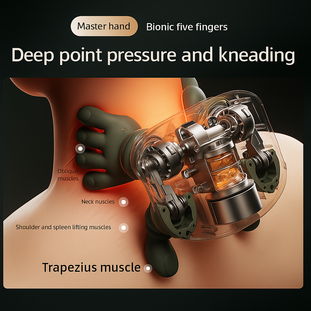 Enjoy an advanced massage experience with our Bionic 4-Finger Hand Technology, designed to replicate the natural motion of a professional therapist. It delivers deep pressure and rhythmic kneading to key areas such as the neck, trapezius, oblique, and shoulder muscles, helping relieve tension, reduce stress, and revitalize your body in just minutes.